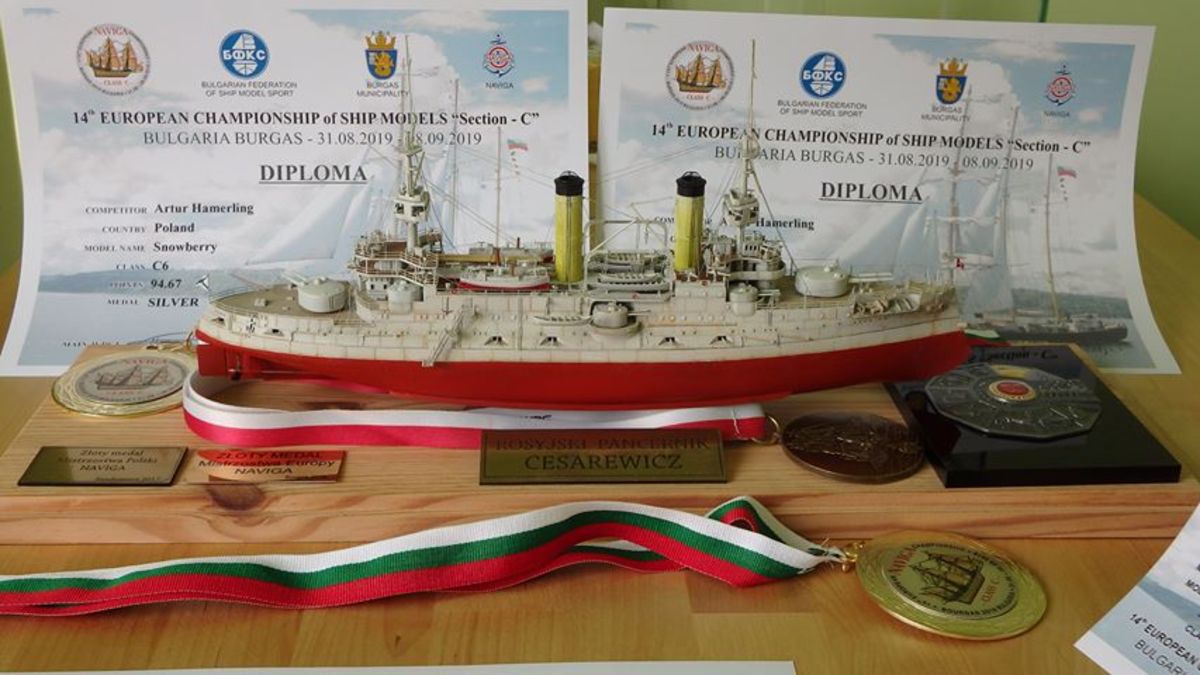 W bułgarskim mieście Burgas odbyły się w dniach 31.08 – 8.09.2019 roku Mistrzostwa Europy w Modelarstwie Okrętowym klas „C” (wystawowe modele statyczne) federacji Naviga. Oceniano w nich prace modelarzy z całego kontynentu. Dwa złote medale i jeden medal srebrny w klasie C 6 (modele plastikowe) otrzymał za swoje prace Artur Hamerling. Złotymi medalami nagrodzono modele pancernika rosyjskiego „Cesarewicz” oraz pancernika japońskiego „Mikasa” wykonane przez niego w skali 1/350. Srebrny medal otrzymał model korwety kanadyjskie „Snowberry” w skali 1/144.