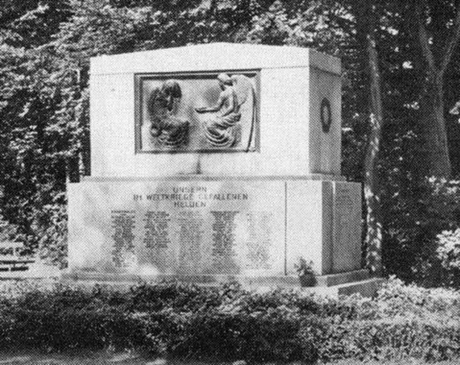 Płyta pochodzi z pomnika wystawionego poległym mieszkańcom Darłowa podczas I wojny światowej.  Pomnik upamiętniający żołnierzy poległych w czasie I wojny światowej odsłonięto uroczyście 4 czerwca 1922 r. na wzgórzu Kopa. Wyko­nano go z granitowych bloków w kształcie tumby spoczywającej na wyso­kim cokole, na którym w pięciu kolumnach umieszczono  nazwiska po­ległych mieszkańców miasta. Na tumbie znajdował się odlany z brązu relief,  przedstawiający młodą niewiastę, przyjmującą z rąk anioła napełnioną czarę. Scena ta była symbolem przerwanego młodego życia ziemskiego i do­stąpieniem niebiańskiej szczęśliwości. Po II wojnie światowej pomnik rozebrano, bloki kamienne ustawiono na skraj parku, a płyta z brązu zaginęła. Znaleziony granitowy blok jest jednym z pięciu, na których wyryto nazwiska poległych mieszkańców Darłowa.  Po odnowieniu zamontowano go na dziedzińcu zamkowym  przy wejściu na wystawę Dirlov- Rügenwalde- Darłowo.
