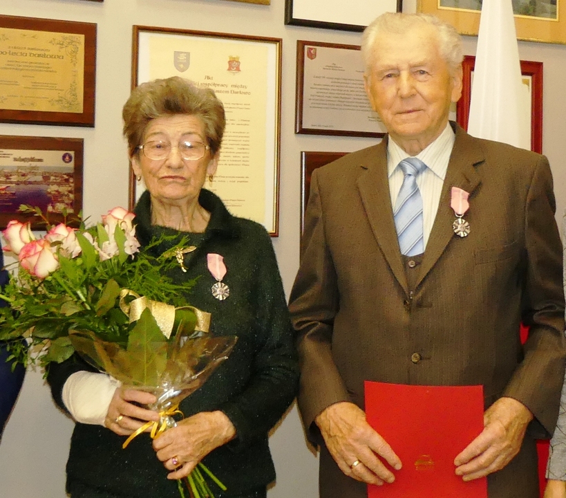 Irena Siadaczka z domu Witkowska urodziła się w grudniu 1931 r. w Janiszowie w województwie lubelskim. Mając 16 lat razem rodzicami przybyła do miejscowości Wołowe Lasy koło Wałcza. Tam na potańcówce poznała swego przyszłego męża. Pani Irena nie tylko zajmowała się wychowywaniem dzieci ale również przędła owczą wełnę i robiła swetry. W roku 1971 państwo Siadaczkowie przybyli do Darłowa i tu się osiedlili. Pan Stanisław jako konserwator i palacz pracował w Rybackiej Stacji Doświadczalnej. Po pracy dorabiał hodując nutrie, lisy, a następnie uprawiał wraz z żoną warzywa. Pani Irena pracowała w PP i UR „Kuter”, a następnie w restauracji „Paloma”. Przez całe lata nie dostała od państwa ani złotówki na wychowanie dzieci. Ciężko było wyszykować sześcioro dzieci do szkoły. Teraz ma emeryturę w kwocie 1160 złotych łącznie z dodatkiem pielęgnacyjnym. Jubilaci przez okres szczęśliwego pożycia małżeńskiego doczekali się sześciorga dzieci, 16 wnuków i 21 prawnuków. Receptą na długoletnie pożycie małżeńskie zdaniem jubilatów jest wyrozumiałość i obopólne wspieranie się szczególnie w trudnych chwilach. Jedno drugiego musi zrozumieć i ustąpić. Państwo Siadaczkowie często spotykają się i wspierają się w gronie rodzinnym. W wolnych chwilach wypoczywają w ogrodowej działce. Na uroczystość wręczenia medali przybyła najbliższa rodzina. Gratulacjom i życzeniom nie było końca. Kamienne Gody to wyjątkowy to jubileusz. Wspólnie przeżyte 70 lat to dowód na istnienie wierności, miłości, wzajemnego zrozumienia oraz istoty związku małżeńskiego. To wzór i piękny przykład do naśladowania dla młodych pokoleń wstępujących w związki małżeńskie. Taka okrągła rocznica ślubu to wzruszająca uroczystość. Przy kawie i torcie i lampce szampana wróciły wspomnienia, piękne chwile i obrazy mieniące się swoistym blaskiem. Jubilatom życzymy dalszych szczęśliwych lat, pełnych zdrowia oraz kolejnych jubileuszy „Brylantowych i Dębowych Godów”.