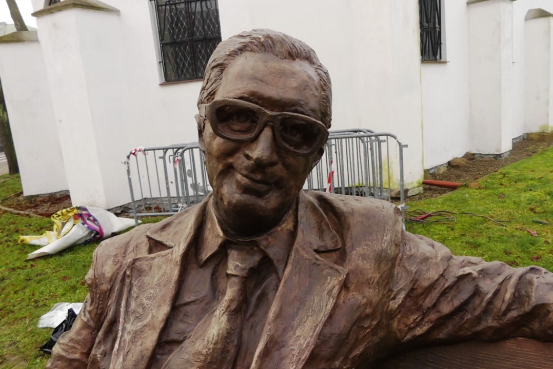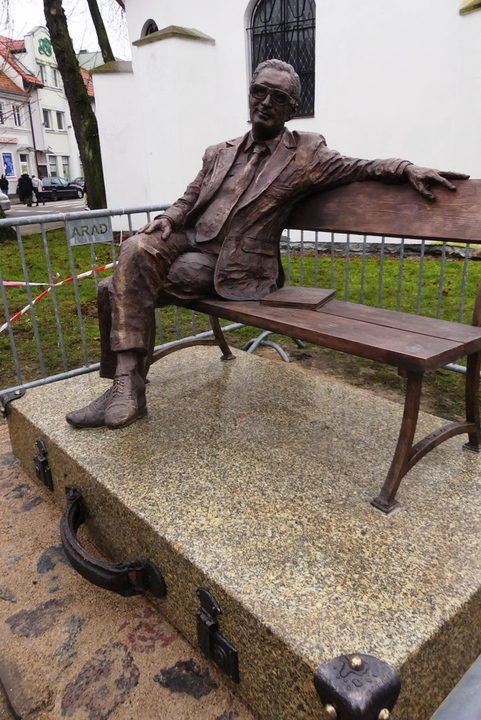 Postać Leopolda Tyrmanda w rogowych okularach zajmuje lewą stronę ławeczki, a na prawo od niej pozostało miejsce dla dwóch osób.