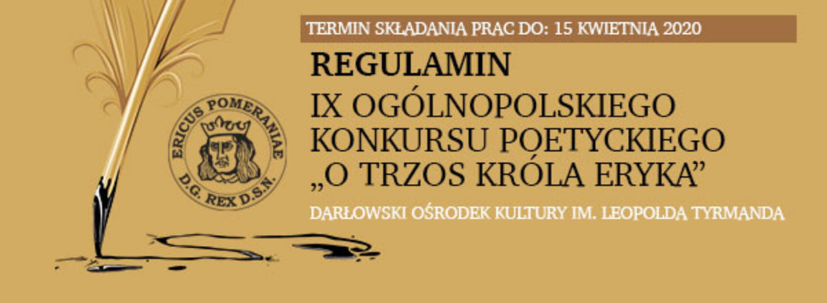 Darłowski Ośrodek Kultury im. Leopolda Tyrmanda zachęca do udziału w IX Ogólnopolskim Konkursie Literackim „O Trzos Króla Eryka". Dokładny regulamin opublikowany został pod adresem http://www.dokdarlowo.pl/domain/dokdarlowo/files/regulamin-ix-ogolnopolskiego-konkursu-poetyckiego.pdf